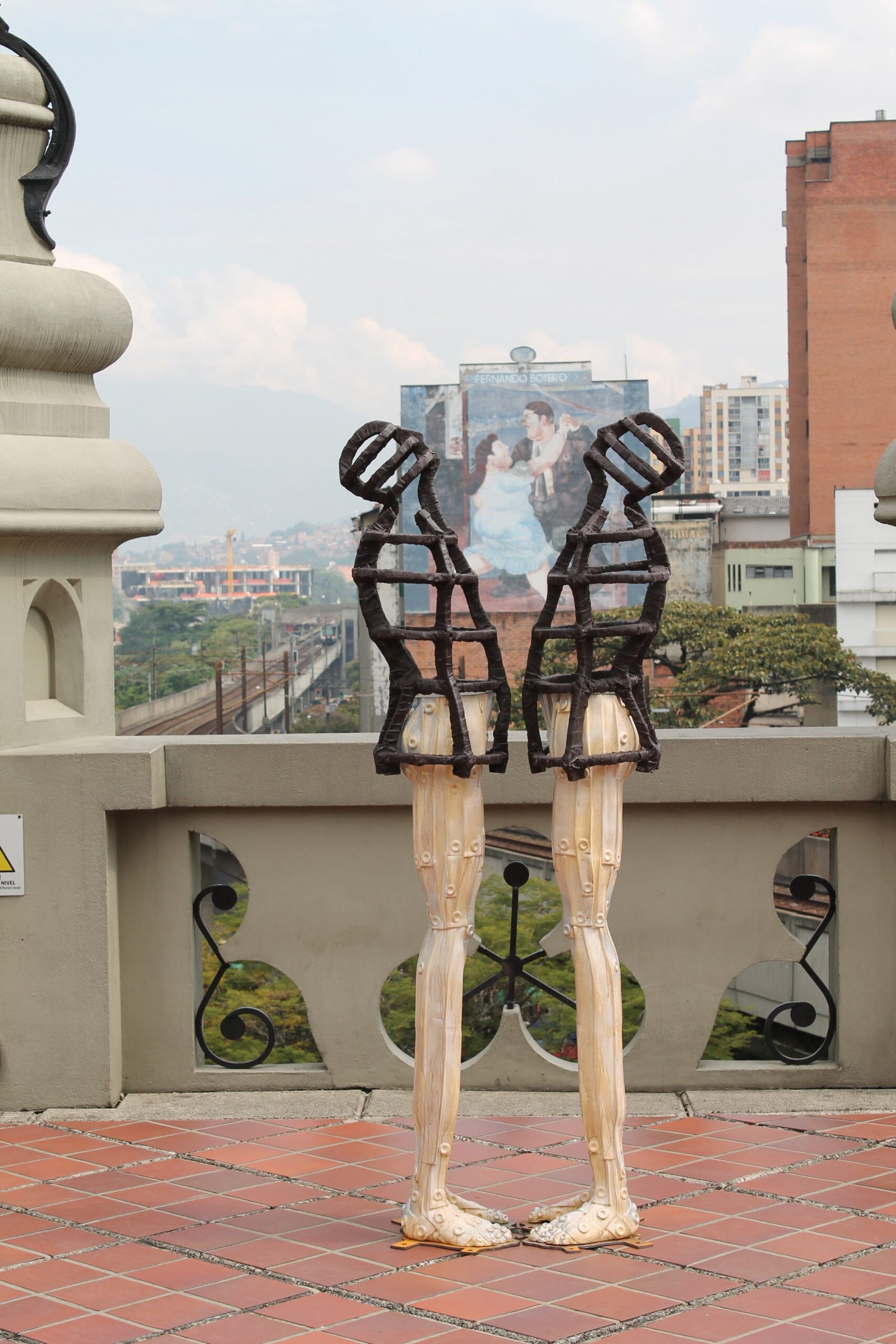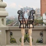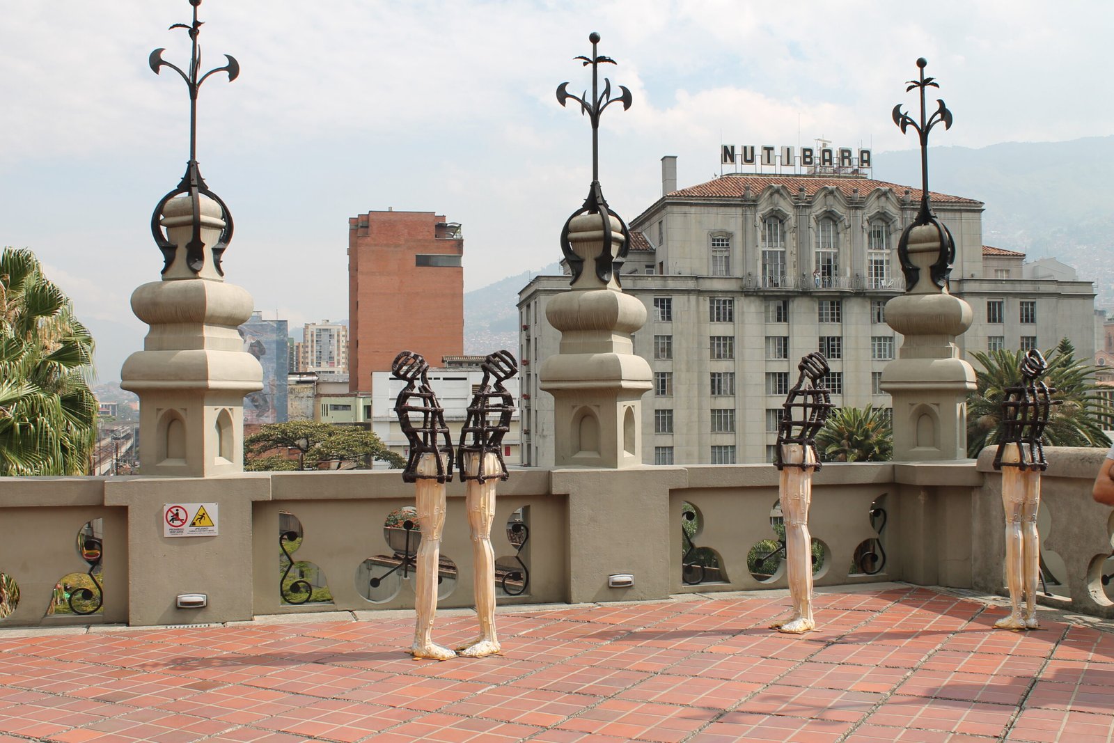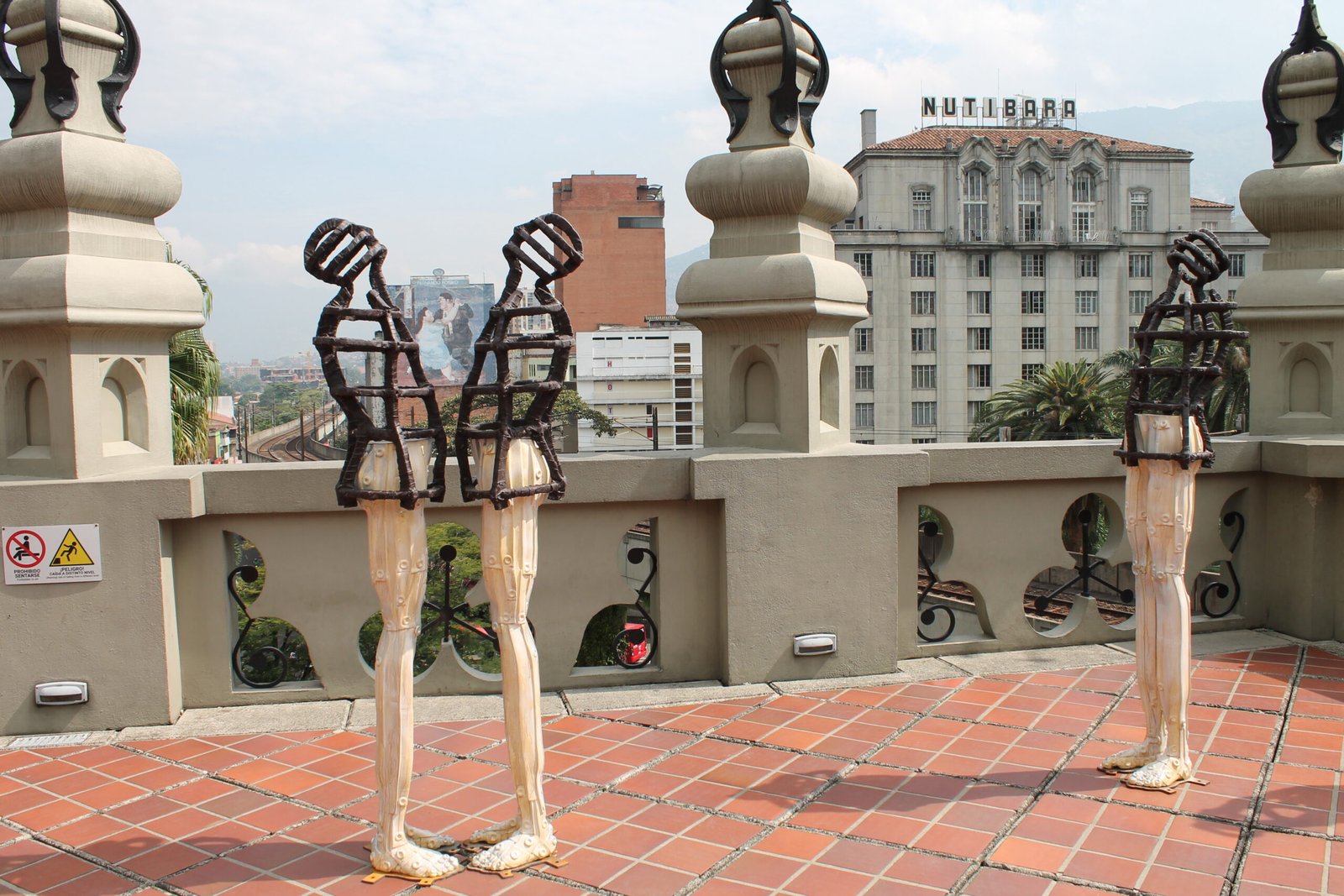 “Summa Omnium” o “la suma de todos” es la más reciente exposición en su ciudad natal, Medellín, la cual encapsula la esencia de su trayectoria artística y su continua exploración sobre la condición humana en la era tecnológica. Esta muestra, de carácter monumental, se despliega en tres instalaciones escultóricas estratégicamente ubicadas: dos en el Palacio de la Cultura —una que se apodera del patio interno y otra que dialoga con la sala de conciertos y espacios expositivos del primer piso—, y una pieza de gran escala que se erige como arte público e interviene el paisaje urbano de la emblemática Plaza Botero. Esta disposición espacial refleja una cuidadosa consideración del diálogo entre la obra y su entorno, un aspecto fundamental en la práctica del artista.