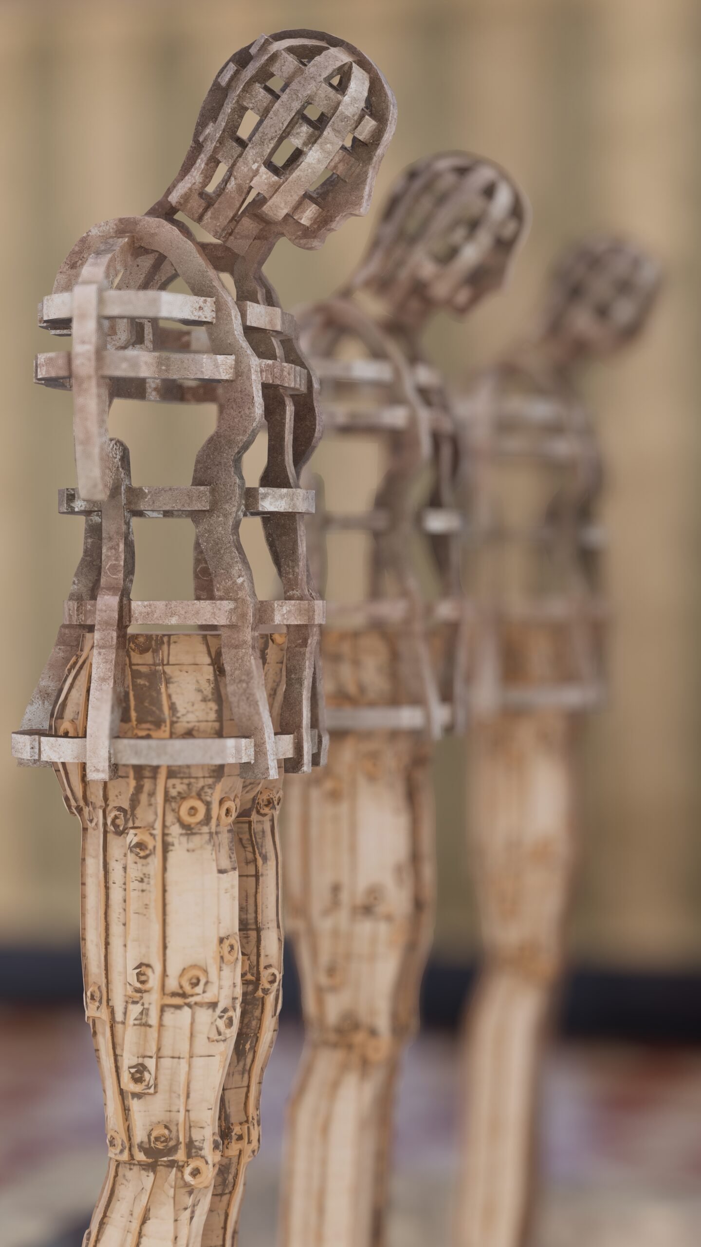 Propuesta para ser ubicada en el antiguo claustro de San Agustín, hoy conocido como el MAQRO – Museo de Arte de Querétaro -, busca crear un espacio de reflexión y resonancia espiritual mediante una instalación escultórica de 16 piezas. Dispuestas estratégicamente en el balcón cuadrado del segundo piso, las esculturas invitan al espectador a una contemplación profunda en un entorno cargado de historia y significado ritual. La exposición tiende puentes entre la historia barroca del claustro y la contemporaneidad de la exploración artística, interactuando con la arquitectura como un eco del pasado y un vehículo de reflexión sobre nuestra temporalidad y espiritualidad.