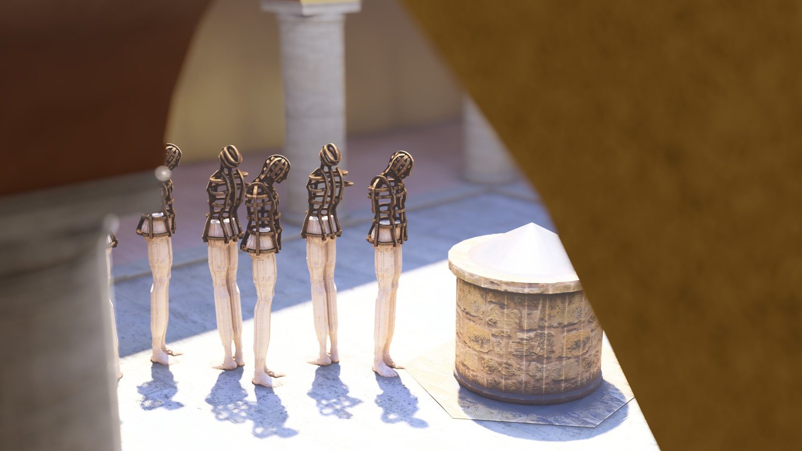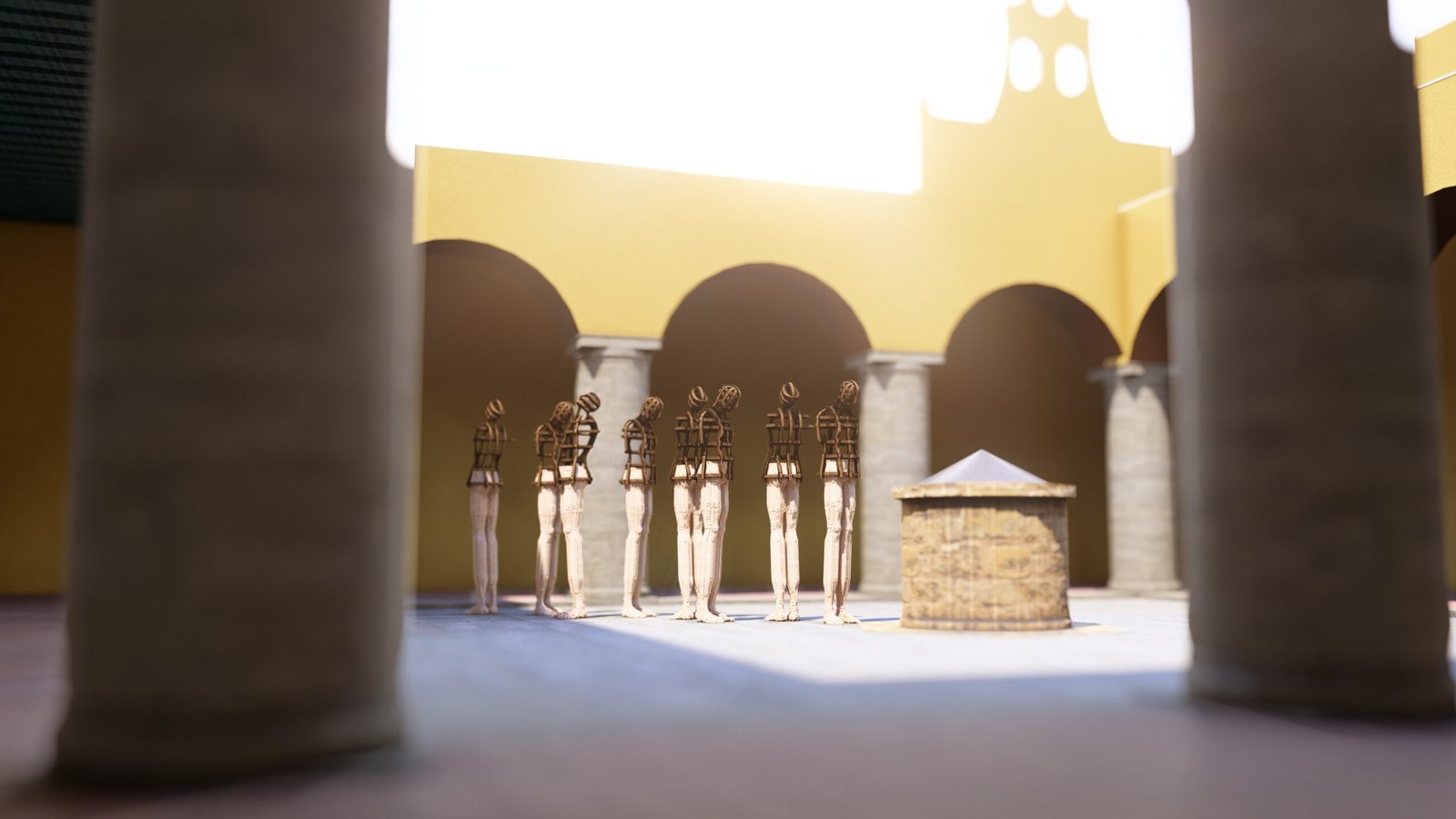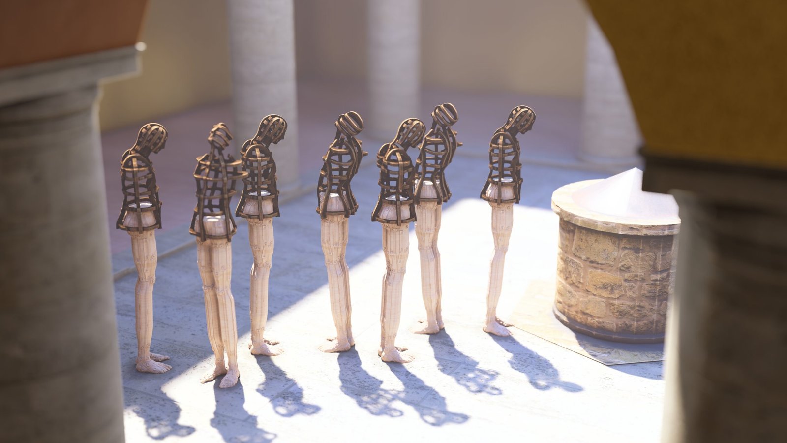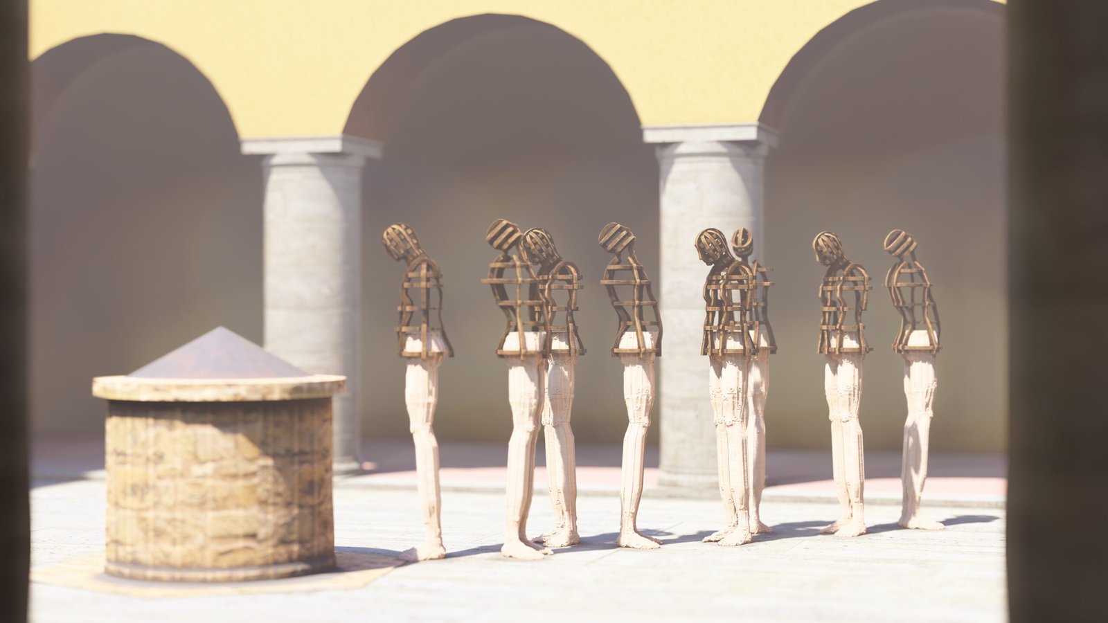 Las esculturas de Joaquín Restrepo, dispuestas frente al aljibe, parecen encarnar esa respiración. Son cuerpos suspendidos entre la vigilia y la plegaria, como si hubieran emergido del propio fondo del pozo: de la memoria líquida que sostiene la historia de este lugar.