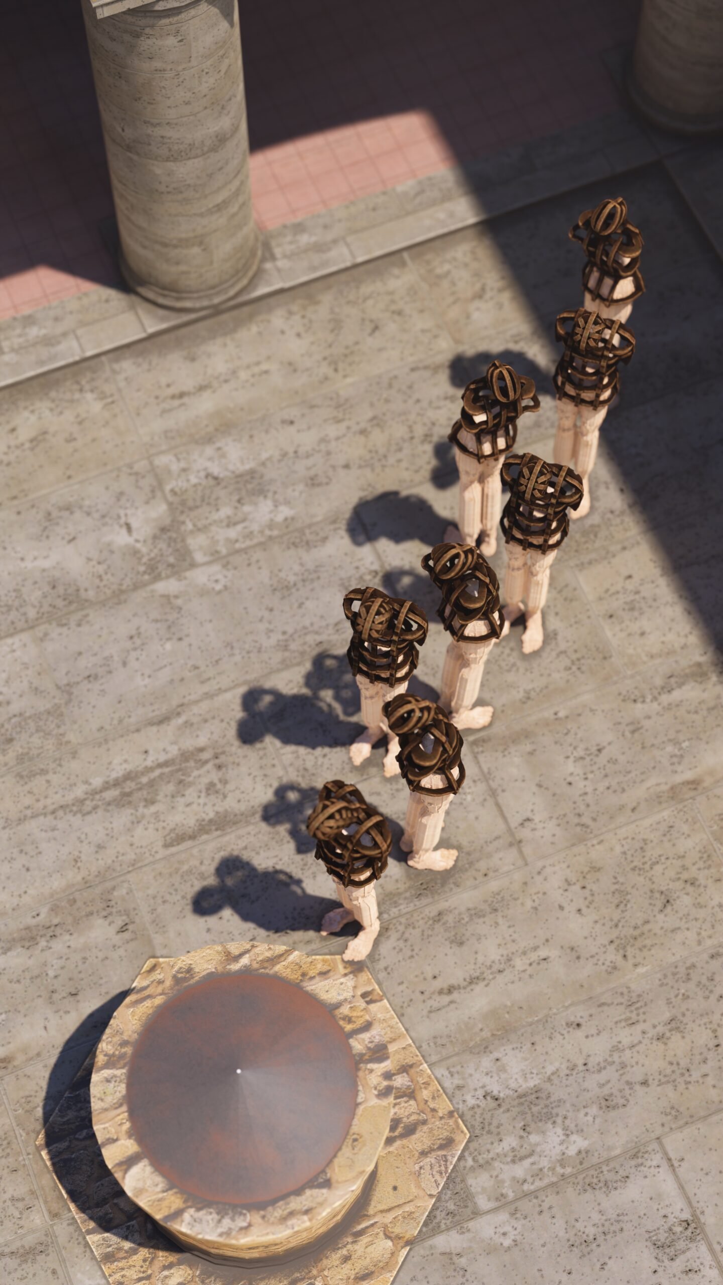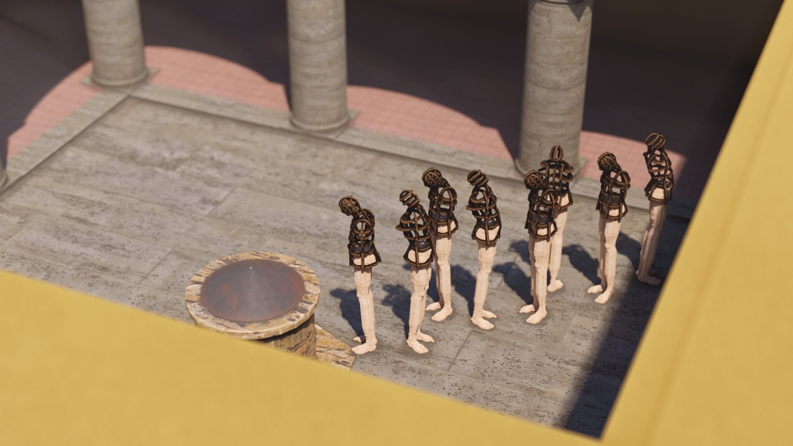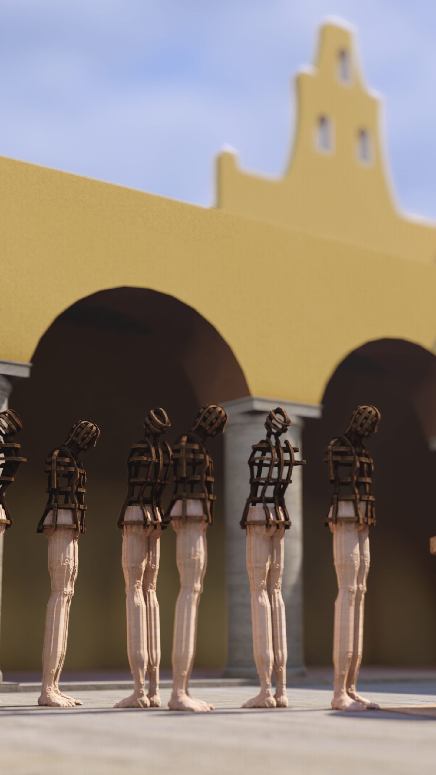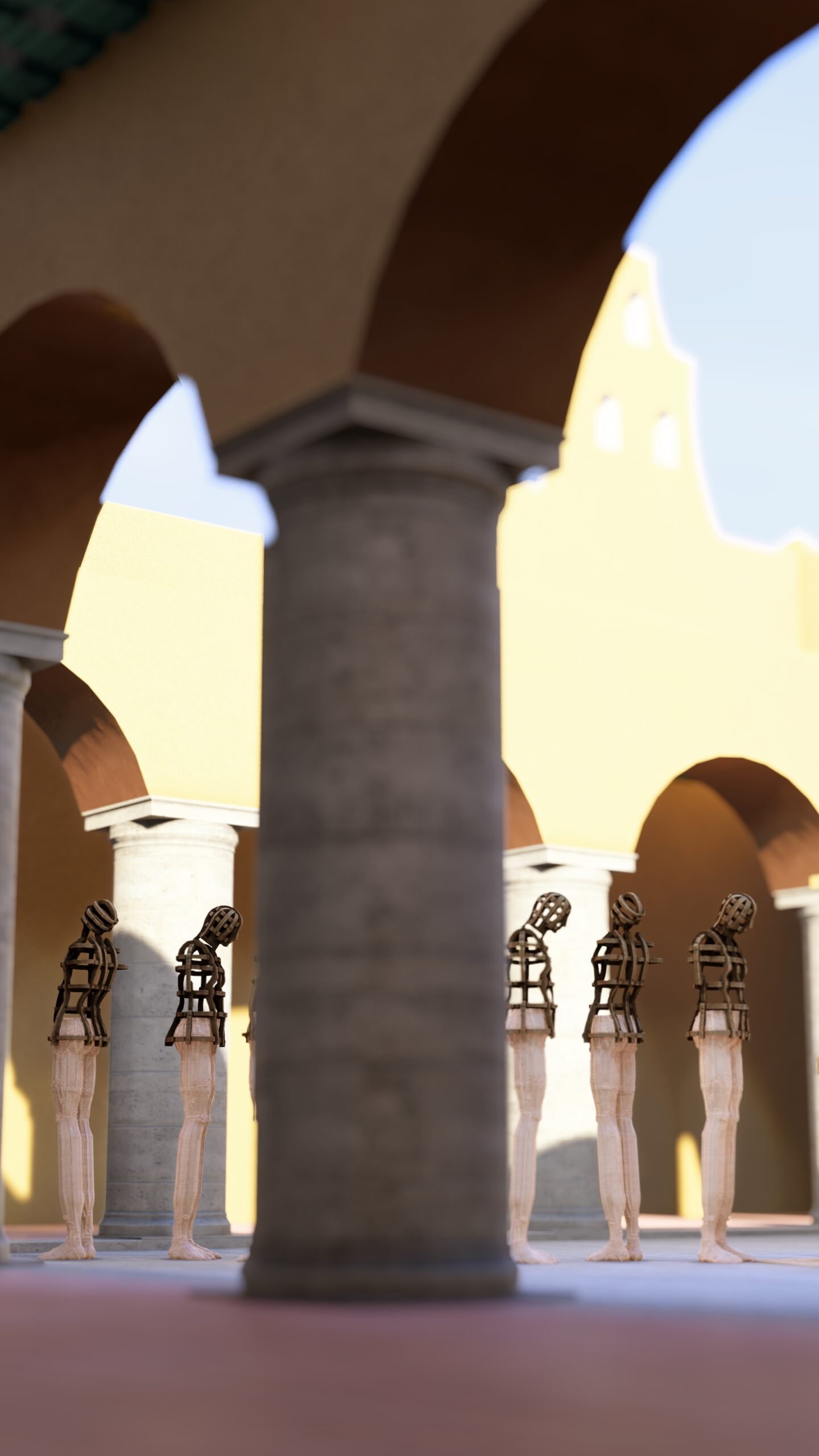 Las esculturas de Joaquín Restrepo, dispuestas frente al aljibe, parecen encarnar esa respiración. Son cuerpos suspendidos entre la vigilia y la plegaria, como si hubieran emergido del propio fondo del pozo: de la memoria líquida que sostiene la historia de este lugar.
