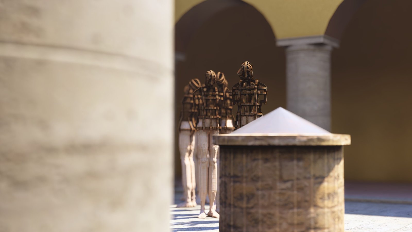 Fons Interior (la fuente interior) habla del agua que circula dentro del ser, invisible y constante. Restrepo convierte el claustro en un cuerpo que recuerda, y al hacerlo, el tiempo deja de ser lineal: se vuelve poroso, como piedra húmeda. Cada escultura es una forma de escucha. No miran el pozo; lo oyen. Su verticalidad austera recuerda los rituales colectivos de sanación y duelo. En Campeche, ciudad levantada frente al mar y sobre la escasez de agua dulce, el aljibe fue una arquitectura de supervivencia. Restrepo reinterpreta ese gesto de contención y lo transforma en metáfora de la experiencia latinoamericana: cuerpos que han debido aprender a guardar, a resistir, a transformar el dolor en forma.