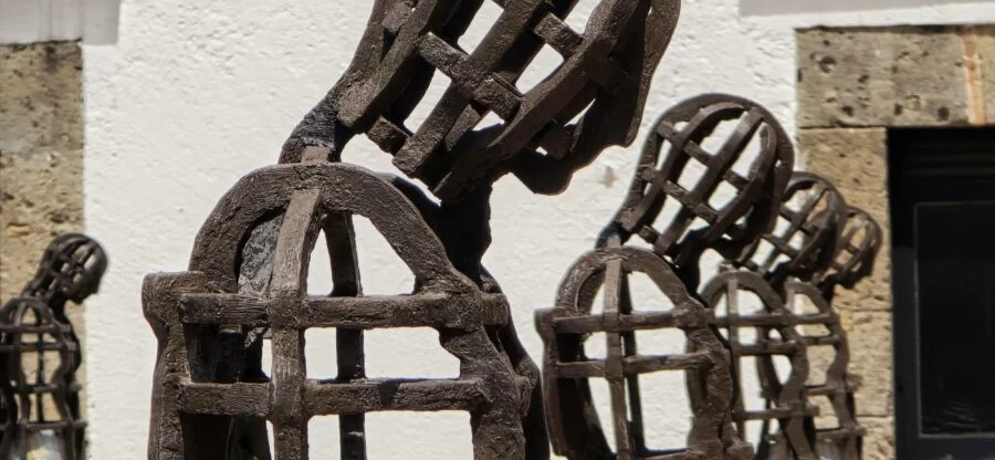 as esculturas de Joaquín Restrepo se caracterizan por su forma humanoide y el uso de materiles como resina y hierro.