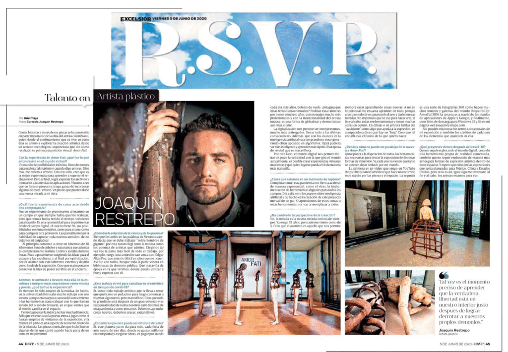 En entrevista con el diario Excélsior (México, 5 de junio de 2020), Joaquín Restrepo reflexiona sobre su proceso creativo en tiempos de confinamiento y la gestación de su exposición virtual Amor Fati. El artista colombiano explica cómo la pandemia lo llevó a explorar nuevos lenguajes digitales, integrando escultura, música, poesía y programación para crear un entorno inmersivo y sensible que invita al espectador a una pausa interior. “Tal vez es el momento preciso de aprender que la verdadera libertad está en nuestro interior justo después de lograr derrotar a nuestros propios demonios”, declaró Restrepo. La exposición, desarrollada como experiencia 3D y accesible desde múltiples plataformas, fusiona su dominio del bronce y el hierro con un lenguaje contemporáneo digital. El artista también compartió su fascinación por la anatomía humana, los símbolos y las tecnologías emergentes como herramientas para canalizar procesos internos de transformación.