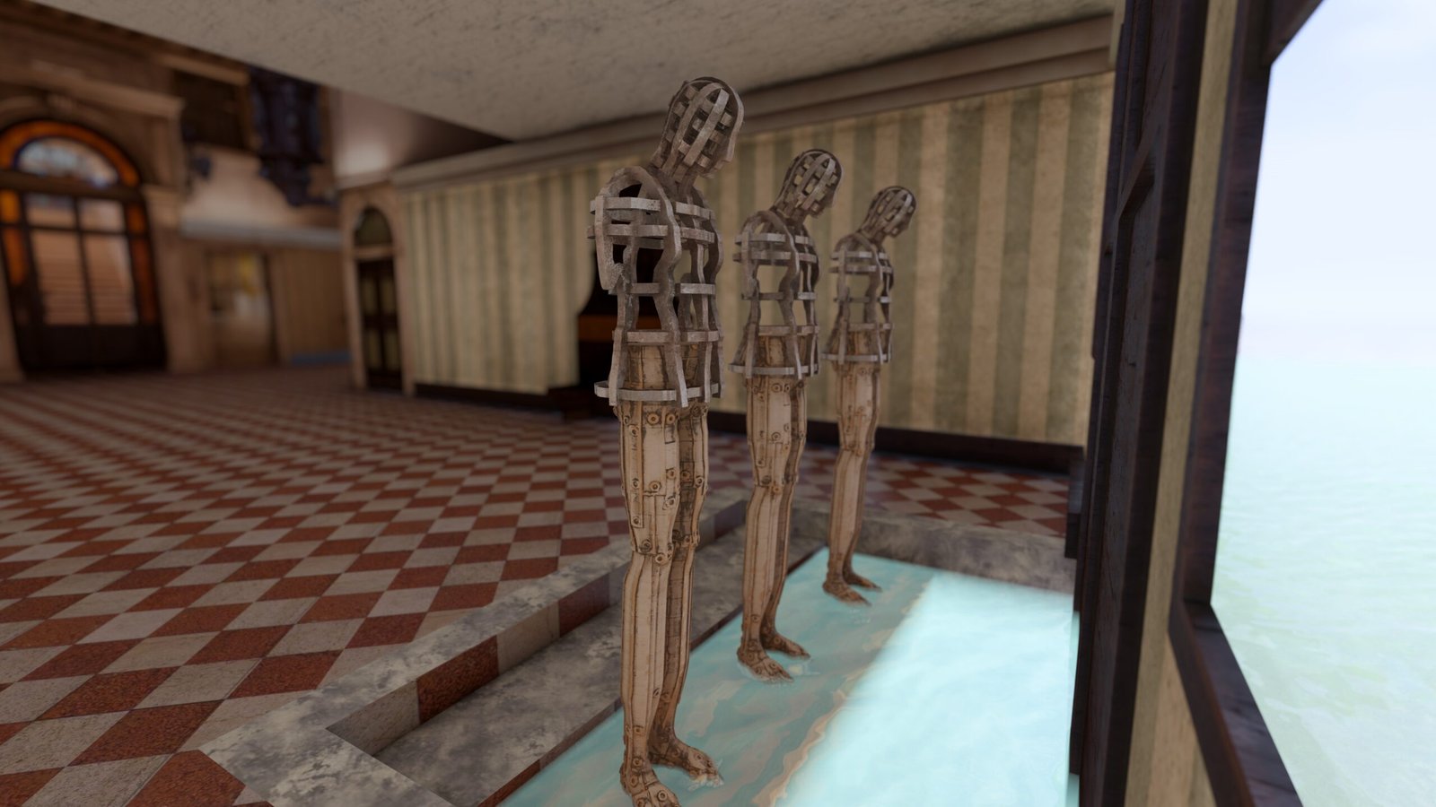 Mientras tanto, el agua insiste en recordar con el ritmo de la marea que va y viene, a veces faltando cuando se retira, elevándose y cayendo hasta tocar los pies. Se convierte en una insistencia material que roza, erosiona y evoca una fractura aún abierta—un latido que pulsa en el umbral entre la sequedad y la humedad, transformado ahora en una condición ontológica que sostiene el silencio y un ritmo que no cesa.